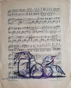 20/035 Wo die Citronen blühn II / Querflöte mit Oleanderblüten, Tinte auf Notenblatt, gerahmt, Maße des Blattes 34 x 54 cm