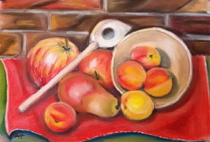 17/032 Aprikosenmarmelade, Pastellkreiden auf Büttenpapier, Blatt ohne Rahmen 30 x 40 cm, im Rahmen mit Passepartout  ca. 46 x 55 cm