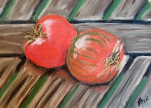 17/038: Zwei Tomaten auf dem Gartentisch, Pastellkreide auf Papier, Blatt ohne Rahmen 15 x 20 cm
