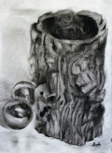16/016: Korkeiche mit Metallkugeln, Kohle auf Papier, m professionellen Rahmen mit Passepartout ca. 63 x 46 cm