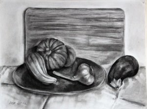 16/012  Zierkürbis, Knoblauch und Aubergine, Kohle auf Papier, Blatt ohne Rahmen 50 x 65 cm, im professionellen Rahmen ca. 55 x 70 cm