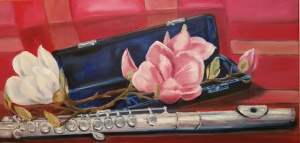 19/055: Querflöte mit Magnolia, Öl auf Leinwand, 30 x 60 cm