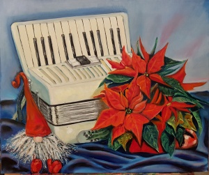 19/063: Akkordeon mit Weihnachtsstern, Öl auf Leinwand, 50×60 cm – VERKAUFT