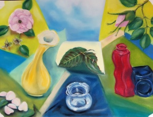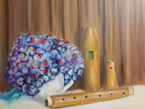 18/047: Blockflöte mit Hortensie, Öl auf Leinwand, 30 x 40 cm